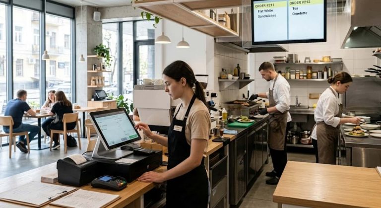 Первое, что замечают после запуска — исчезает устная передача заказов. Официант вбивает позиции в мобильный терминал, заказ мгновенно уходит на кухонный экран кафе. Повар видит очередь, приоритеты и модификации. Никто ничего не переспрашивает.